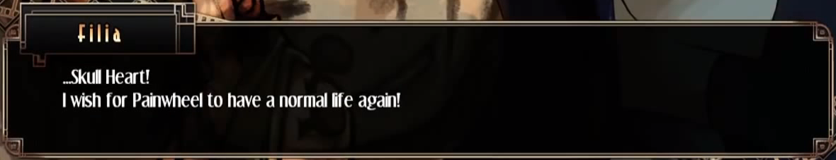 Filia wised for Painwheel to have a normal life. That's what she got and she became the Skullgirl.